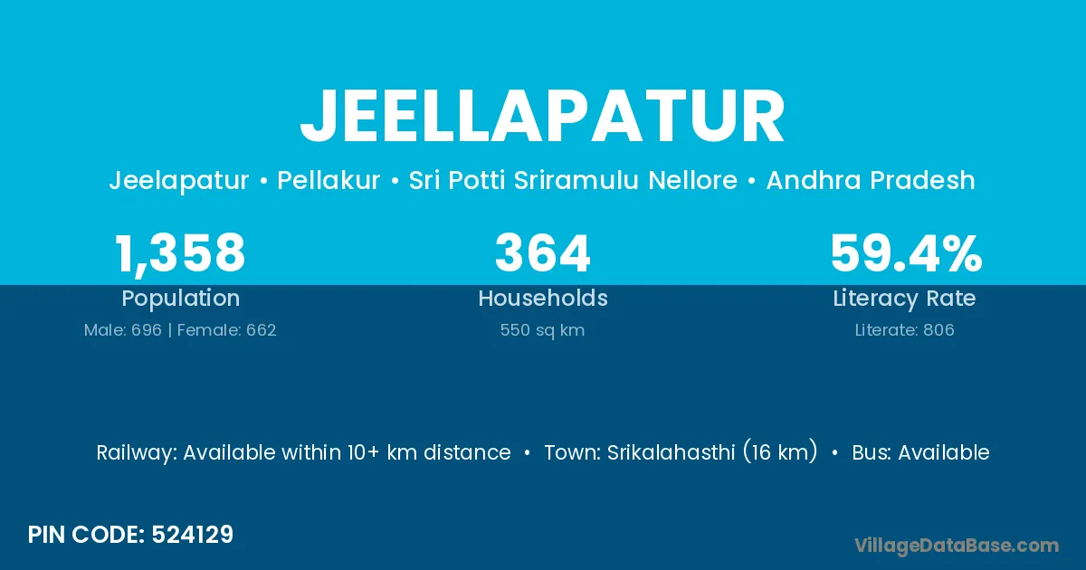 Srikalahasthi (16 km) is the nearest town to Jeellapatur village for major economic activities and is located approximately 16 km away.