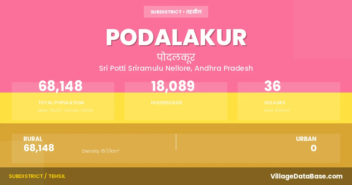 According to the 2011 census The total area of Podalakur Mandal is 434 km², with a population of 68148 people. The population density is 157 inhabitants per square kilometre, and there are approximately 18089 houses in the sub district.