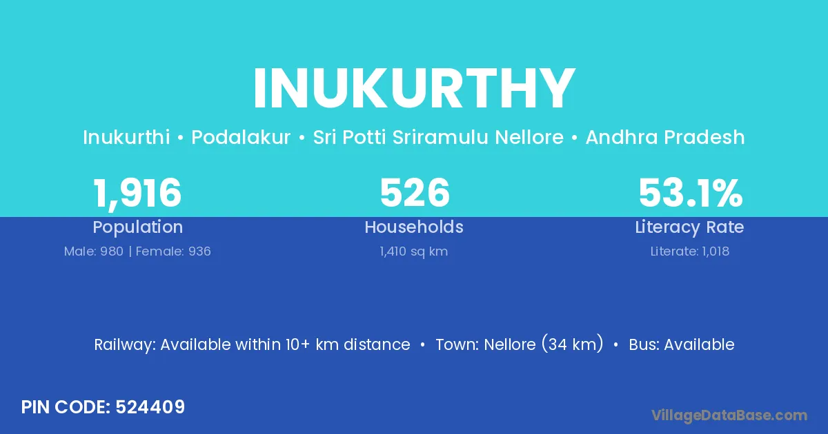 Nellore (34 km) is the nearest town to Inukurthy village for major economic activities and is located approximately 34 km away.