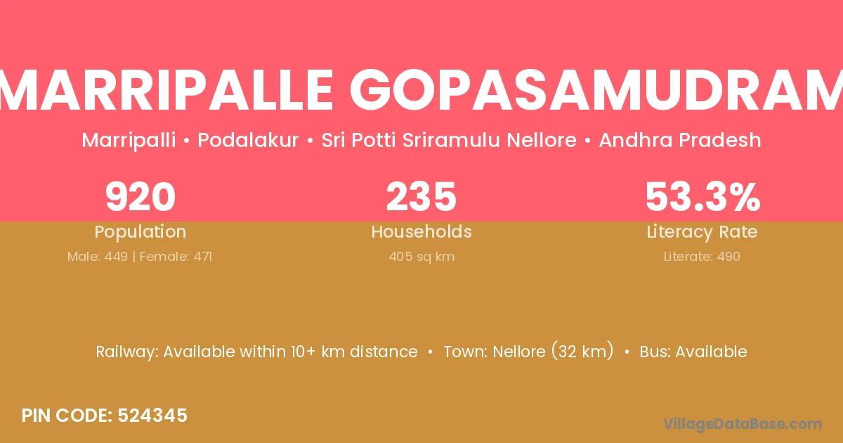 Marripalle Gopasamudram village has a total population of 920 people, of which 449 are males and 471 are females.