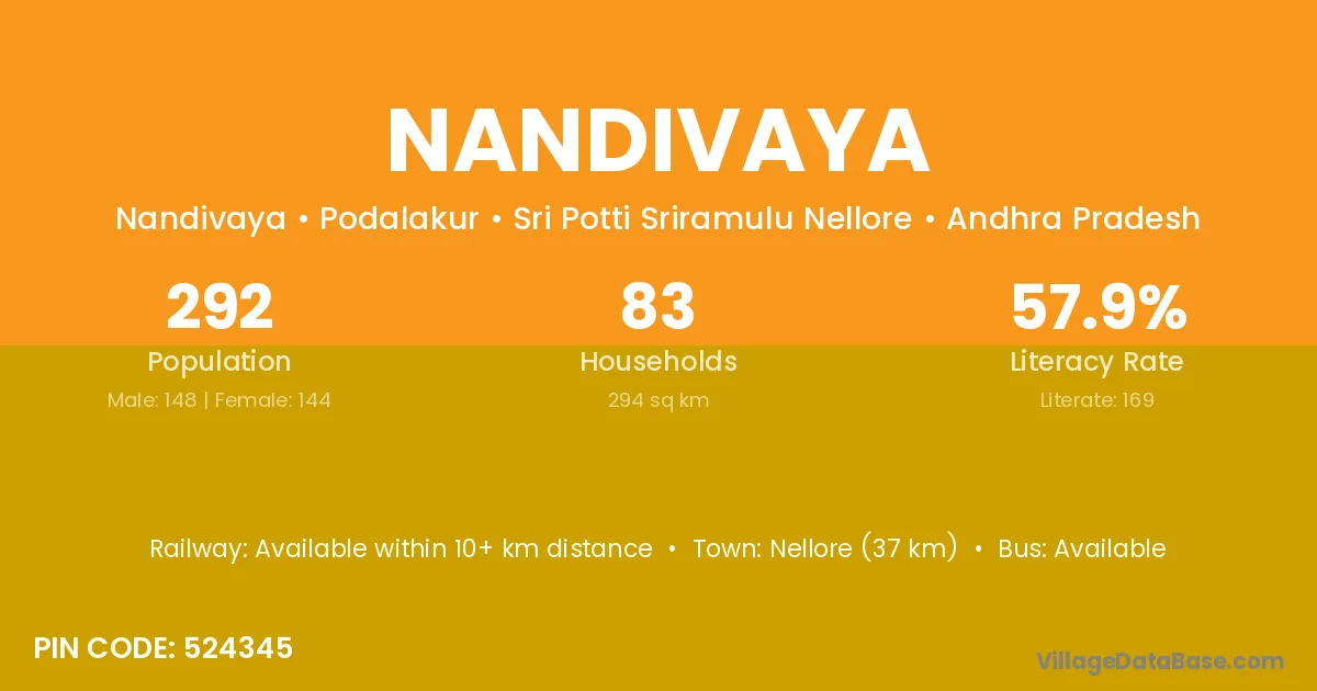 Nellore (37 km) is the nearest town to Nandivaya village for major economic activities and is located approximately 37 km away.