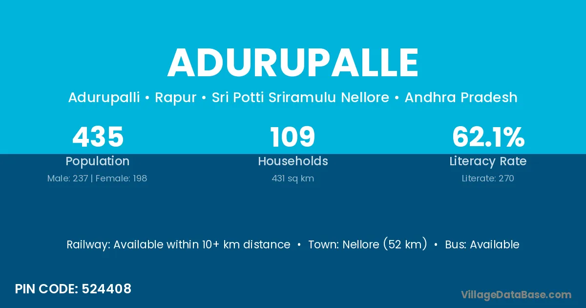 Nellore (52 km) is the nearest town to Adurupalle village for major economic activities and is located approximately 52 km away.