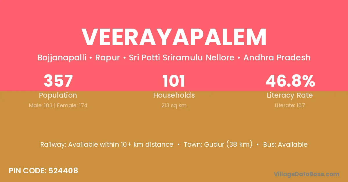 Veerayapalem village has a total population of 357 people, of which 183 are males and 174 are females.