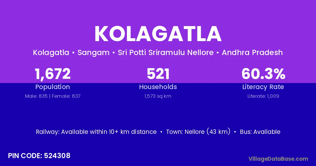 Nellore (43 km) is the nearest town to Kolagatla village for major economic activities and is located approximately 43 km away.