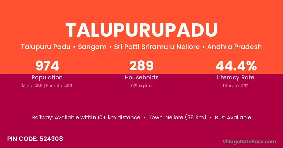 Talupurupadu village has a total population of 974 people, of which 485 are males and 489 are females.