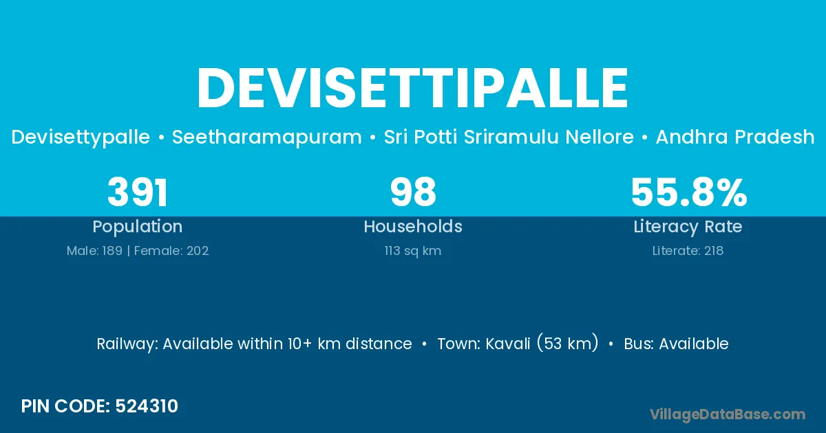 Kavali (53 km) is the nearest town to Devisettipalle village for major economic activities and is located approximately 53 km away.