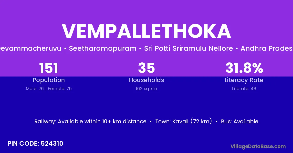 Kavali (72 km) is the nearest town to Vempallethoka village for major economic activities and is located approximately 72 km away.