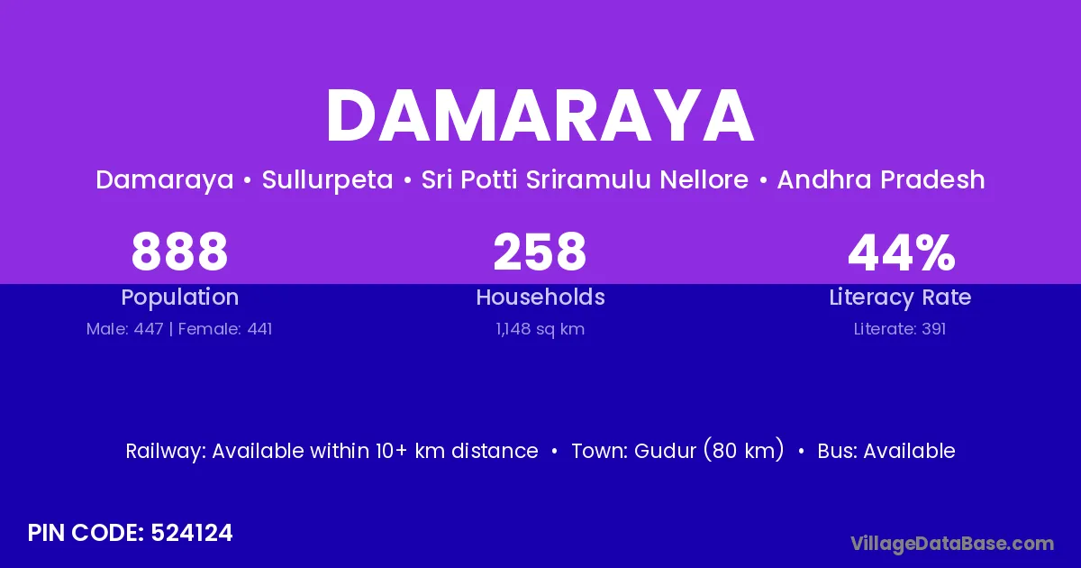 Gudur (80 km) is the nearest town to Damaraya village for major economic activities and is located approximately 80 km away.