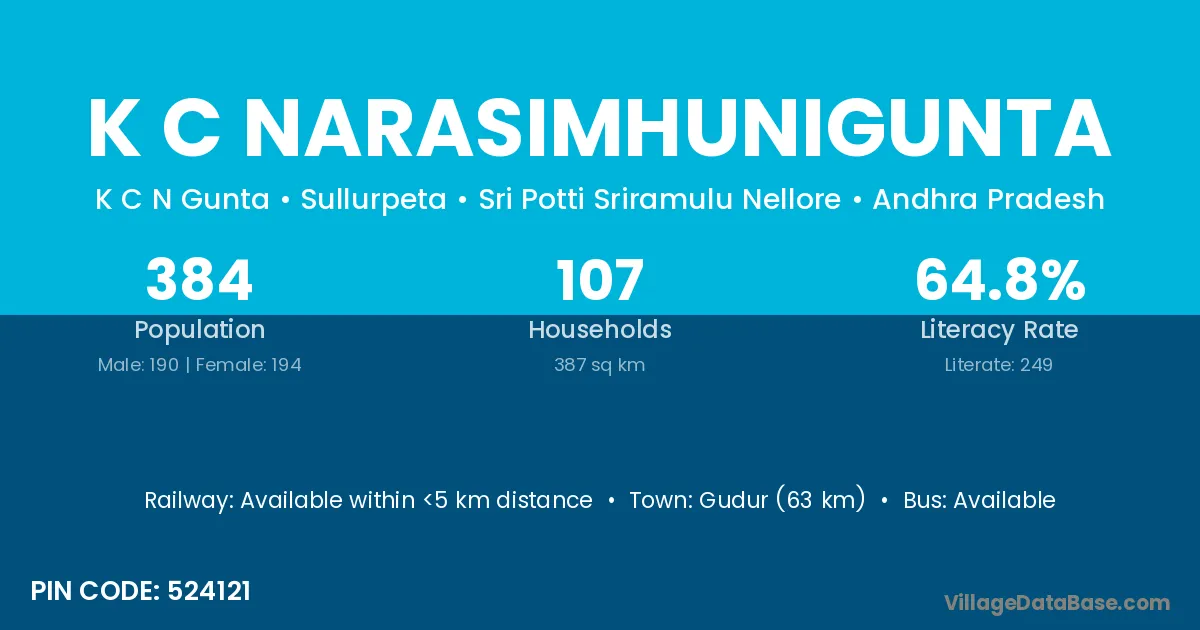 K C Narasimhunigunta village has a total population of 384 people, of which 190 are males and 194 are females.