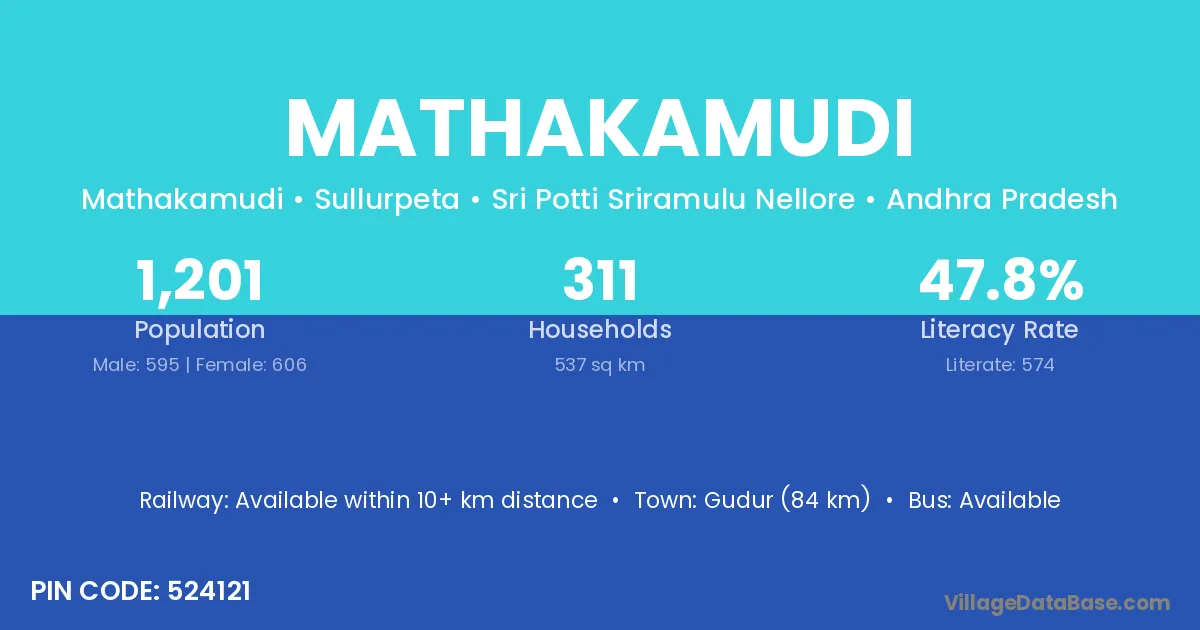 Gudur (84 km) is the nearest town to Mathakamudi village for major economic activities and is located approximately 84 km away.