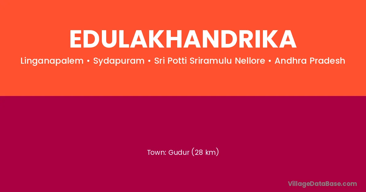 Gudur (28 km) is the nearest town to Edulakhandrika village for major economic activities and is located approximately 28 km away.