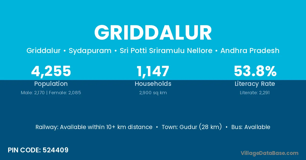Gudur (28 km) is the nearest town to Griddalur village for major economic activities and is located approximately 28 km away.