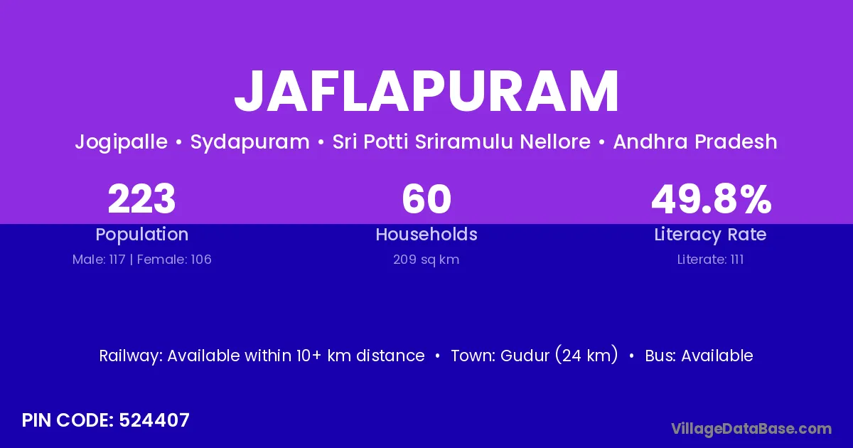 Gudur (24 km) is the nearest town to Jaflapuram village for major economic activities and is located approximately 24 km away.