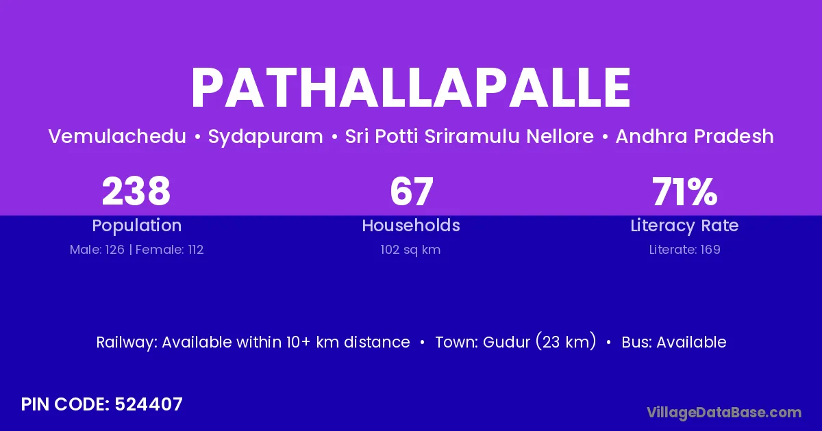 Gudur (23 km) is the nearest town to Pathallapalle village for major economic activities and is located approximately 23 km away.