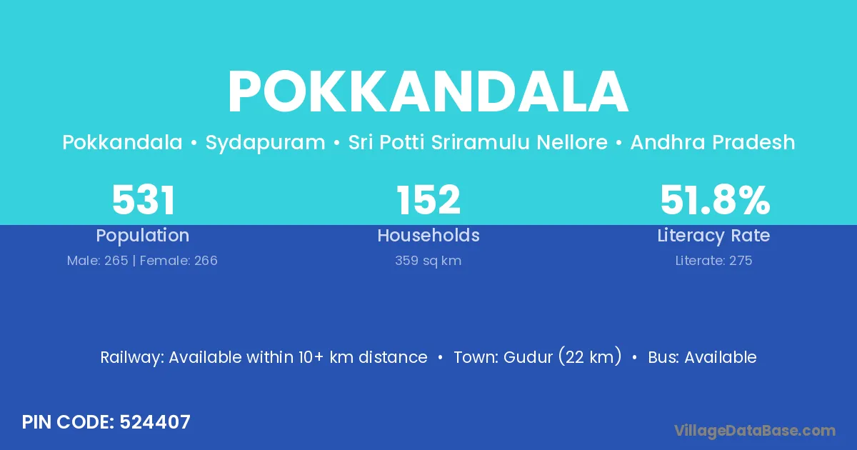 Gudur (22 km) is the nearest town to Pokkandala village for major economic activities and is located approximately 22 km away.