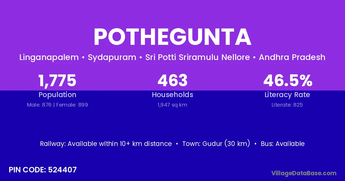 Gudur (30 km) is the nearest town to Pothegunta village for major economic activities and is located approximately 30 km away.