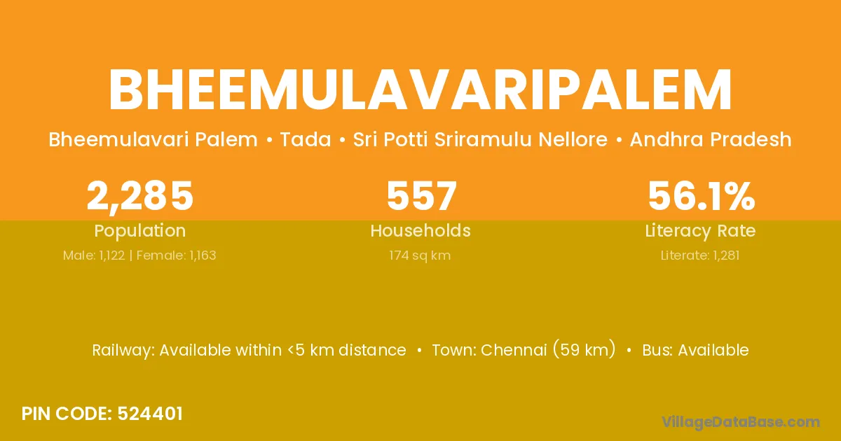 Chennai (59 km) is the nearest town to Bheemulavaripalem village for major economic activities and is located approximately 59 km away.