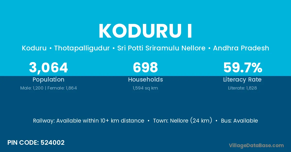 Nellore (24 km) is the nearest town to Koduru I village for major economic activities and is located approximately 24 km away.