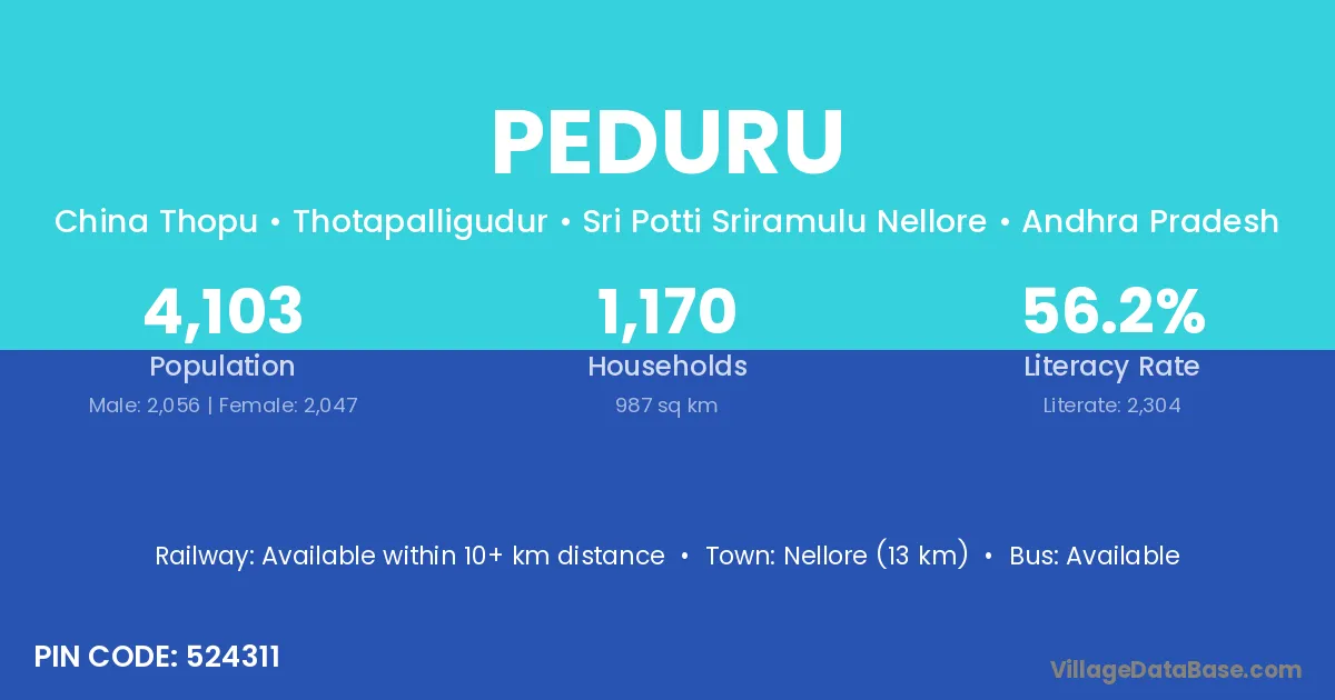 Nellore (13 km) is the nearest town to Peduru village for major economic activities and is located approximately 13 km away.