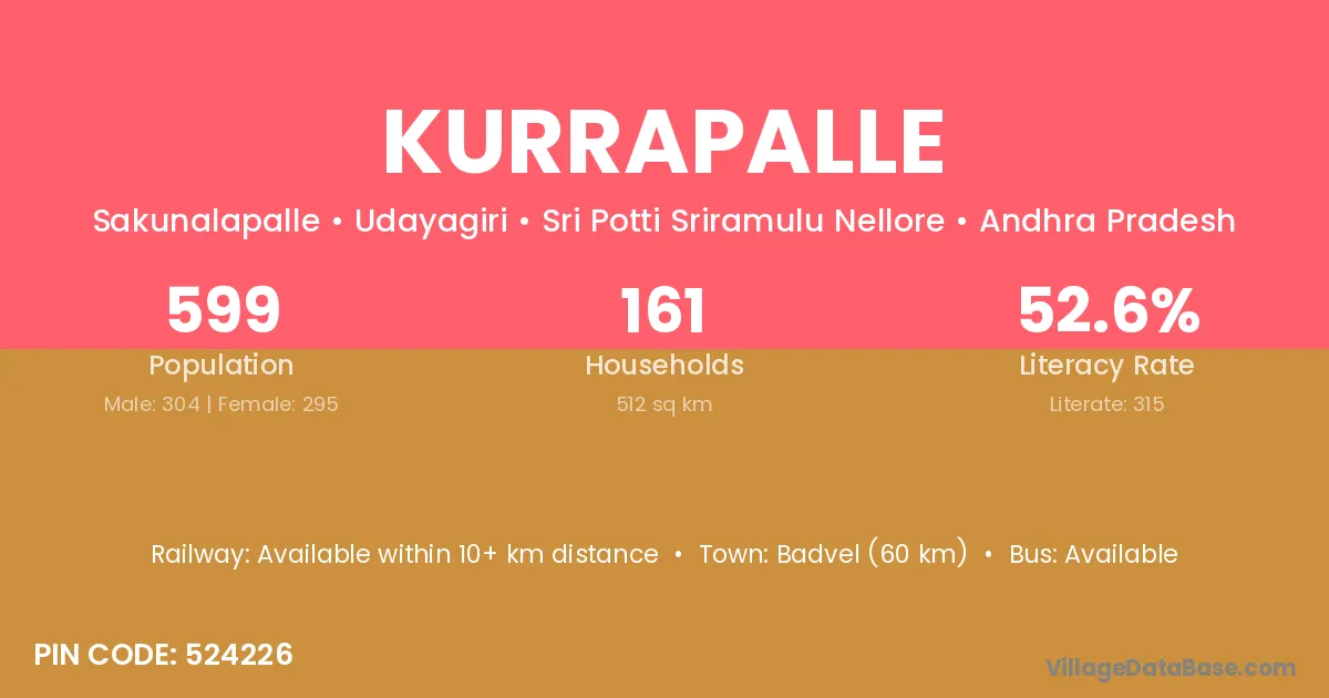 Badvel (60 km) is the nearest town to Kurrapalle village for major economic activities and is located approximately 60 km away.