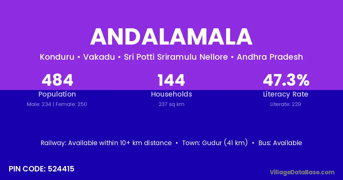 Gudur (41 km) is the nearest town to Andalamala village for major economic activities and is located approximately 41 km away.
