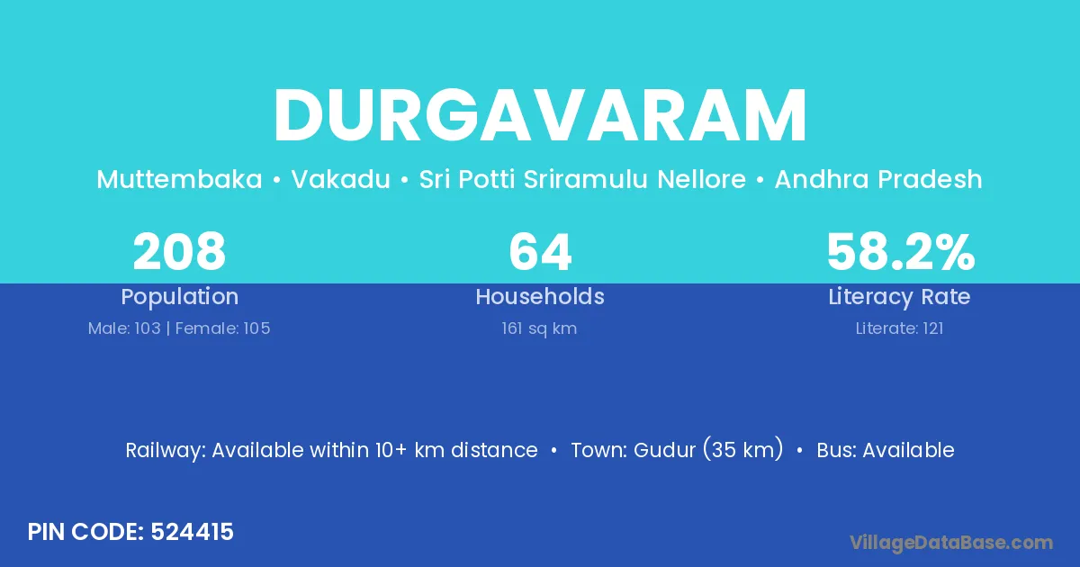 Durgavaram village has a total population of 208 people, of which 103 are males and 105 are females.