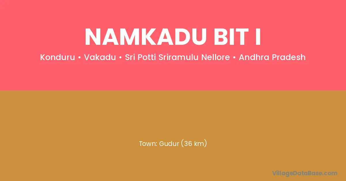 Gudur (36 km) is the nearest town to Namkadu Bit I village for major economic activities and is located approximately 36 km away.