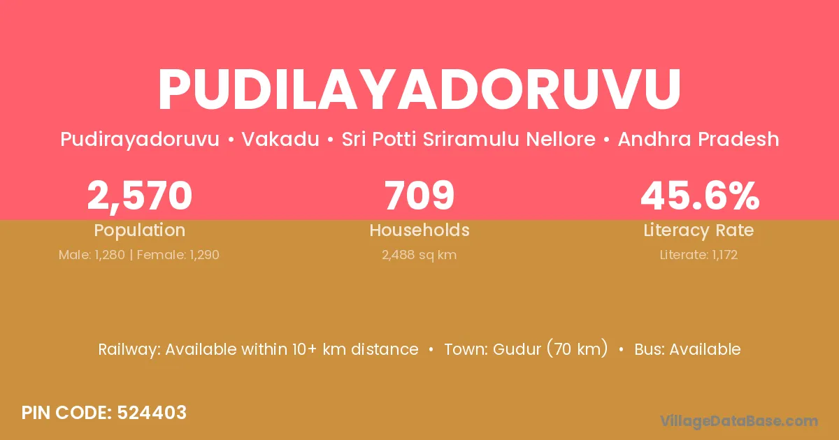 Gudur (70 km) is the nearest town to Pudilayadoruvu village for major economic activities and is located approximately 70 km away.
