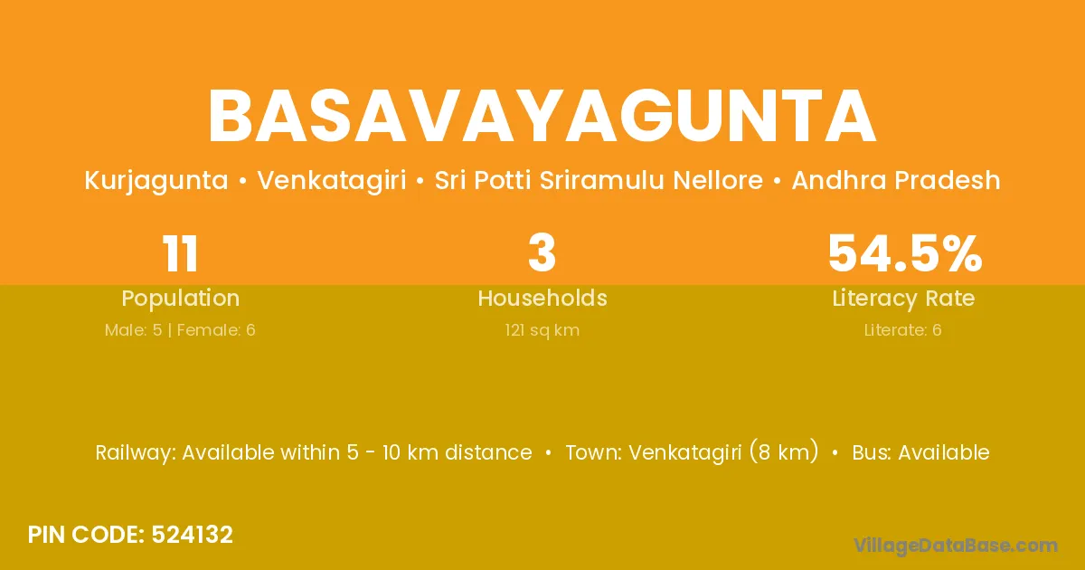 Venkatagiri (8 km) is the nearest town to Basavayagunta village for major economic activities and is located approximately 8 km away.