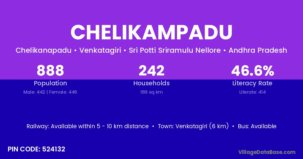 Venkatagiri (6 km) is the nearest town to Chelikampadu village for major economic activities and is located approximately 6 km away.