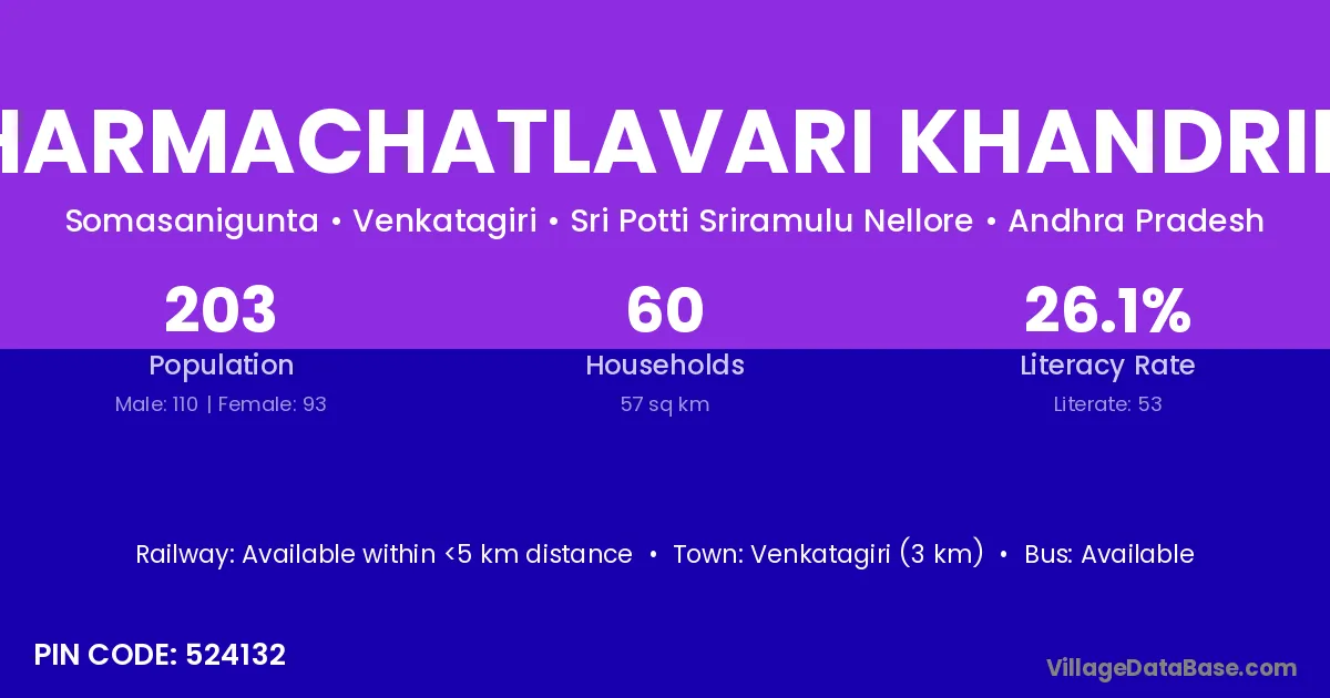 Venkatagiri (3 km) is the nearest town to Dharmachatlavari Khandrika village for major economic activities and is located approximately 3 km away.