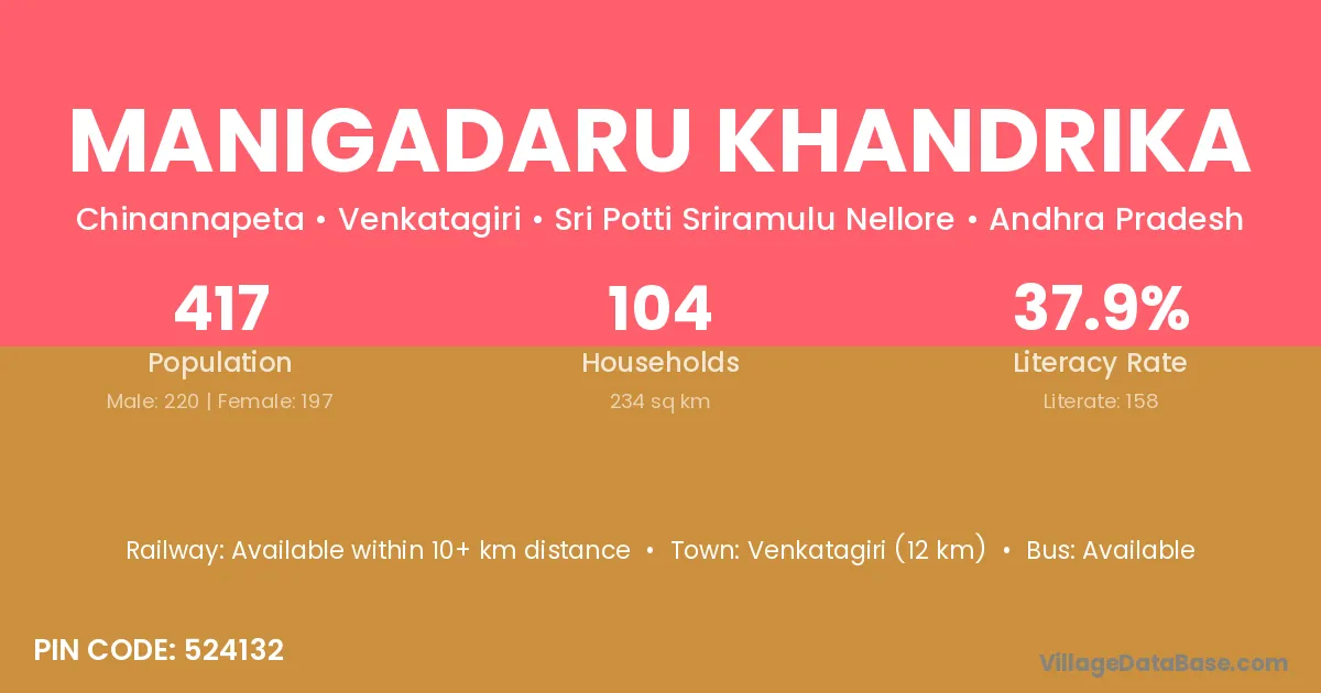 Venkatagiri (12 km) is the nearest town to Manigadaru Khandrika village for major economic activities and is located approximately 12 km away.