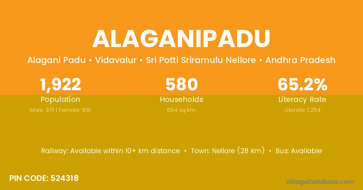 Nellore (28 km) is the nearest town to Alaganipadu village for major economic activities and is located approximately 28 km away.