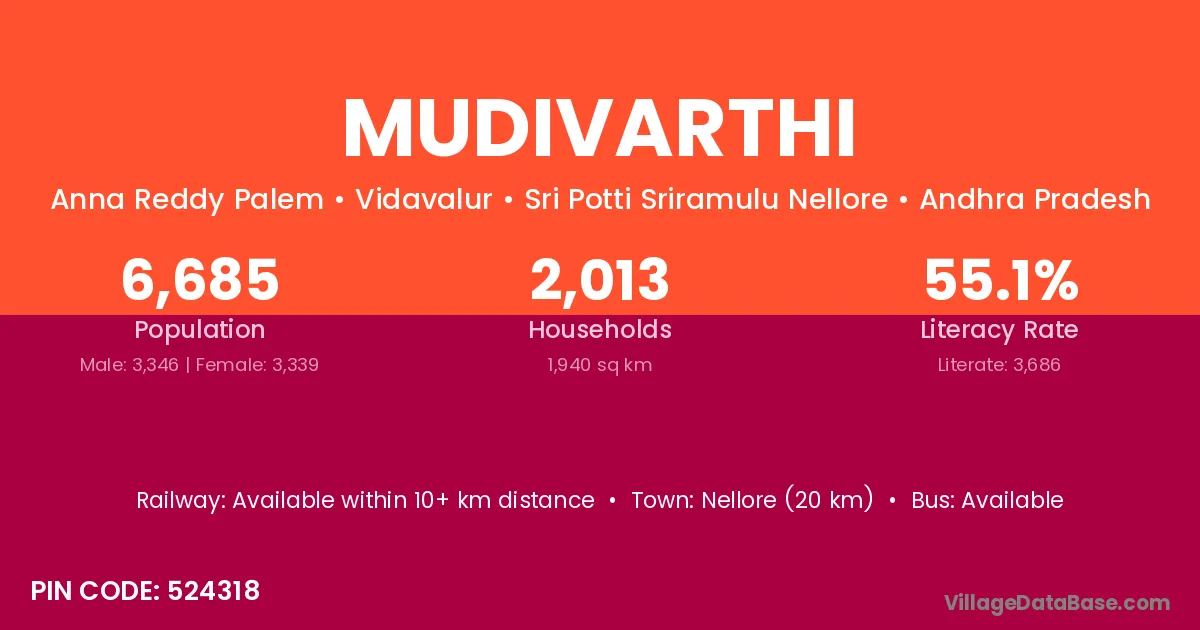 Nellore (20 km) is the nearest town to Mudivarthi village for major economic activities and is located approximately 20 km away.
