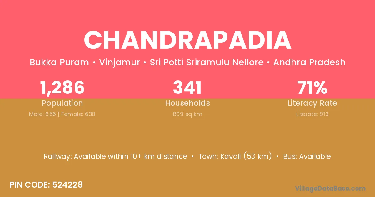 Kavali (53 km) is the nearest town to Chandrapadia village for major economic activities and is located approximately 53 km away.
