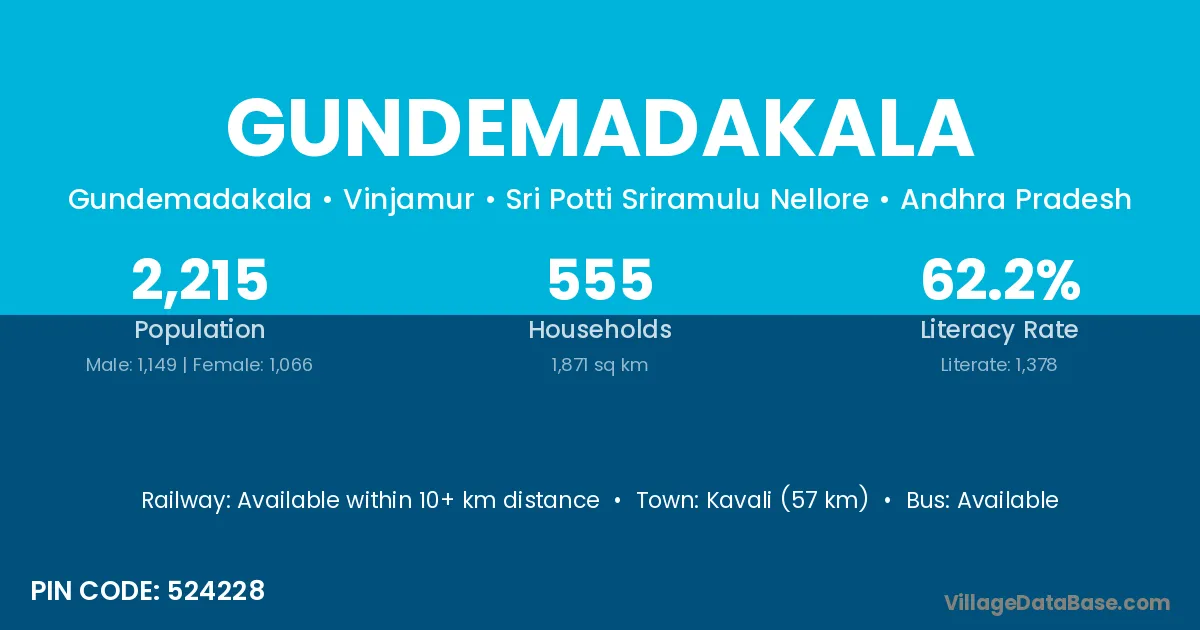 Kavali (57 km) is the nearest town to Gundemadakala village for major economic activities and is located approximately 57 km away.