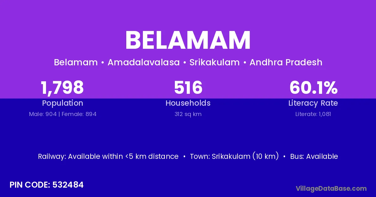 Srikakulam (10 km) is the nearest town to Belamam village for major economic activities and is located approximately 10 km away.