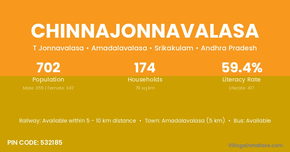 Amadalavalasa (5 km) is the nearest town to Chinnajonnavalasa village for major economic activities and is located approximately 5 km away.