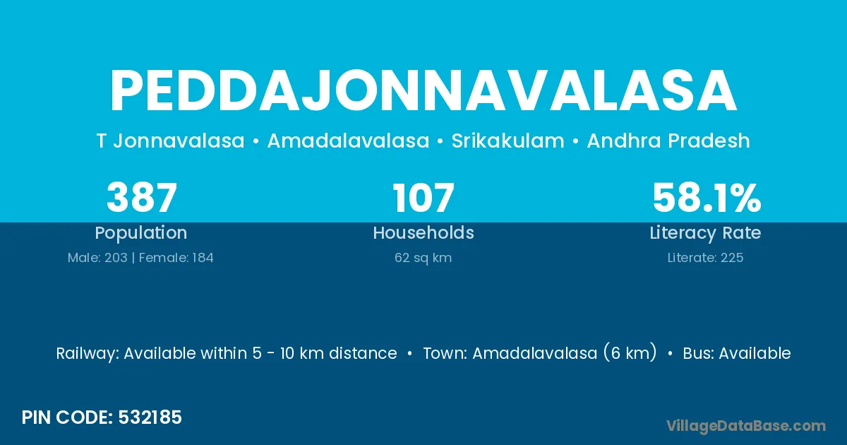 Peddajonnavalasa village has a total population of 387 people, of which 203 are males and 184 are females.