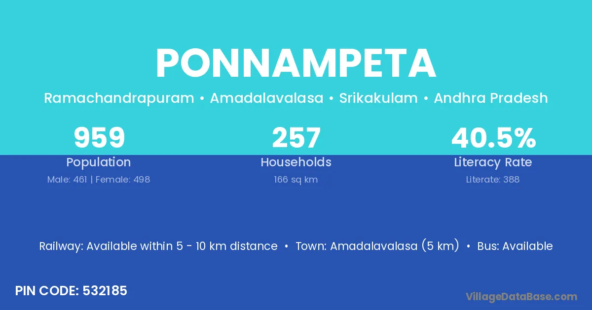 Amadalavalasa (5 km) is the nearest town to Ponnampeta village for major economic activities and is located approximately 5 km away.