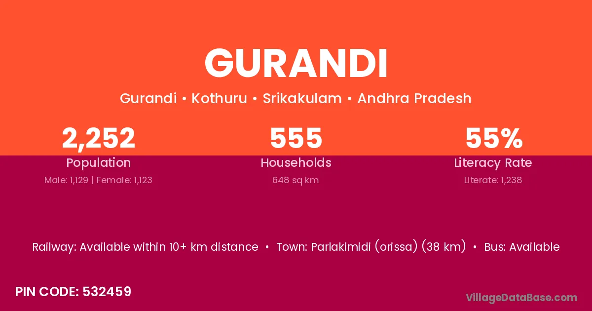 Amadalavalasa (74 km) is the nearest town to Gurandi village for major economic activities and is located approximately 74 km away.