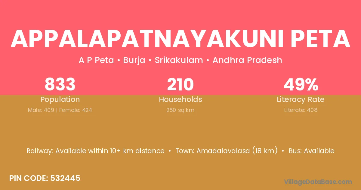 Amadalavalasa (18 km) is the nearest town to Appalapatnayakuni Peta village for major economic activities and is located approximately 18 km away.