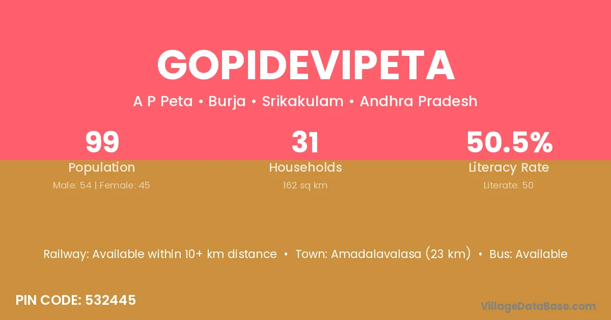 Amadalavalasa (23 km) is the nearest town to Gopidevipeta village for major economic activities and is located approximately 23 km away.