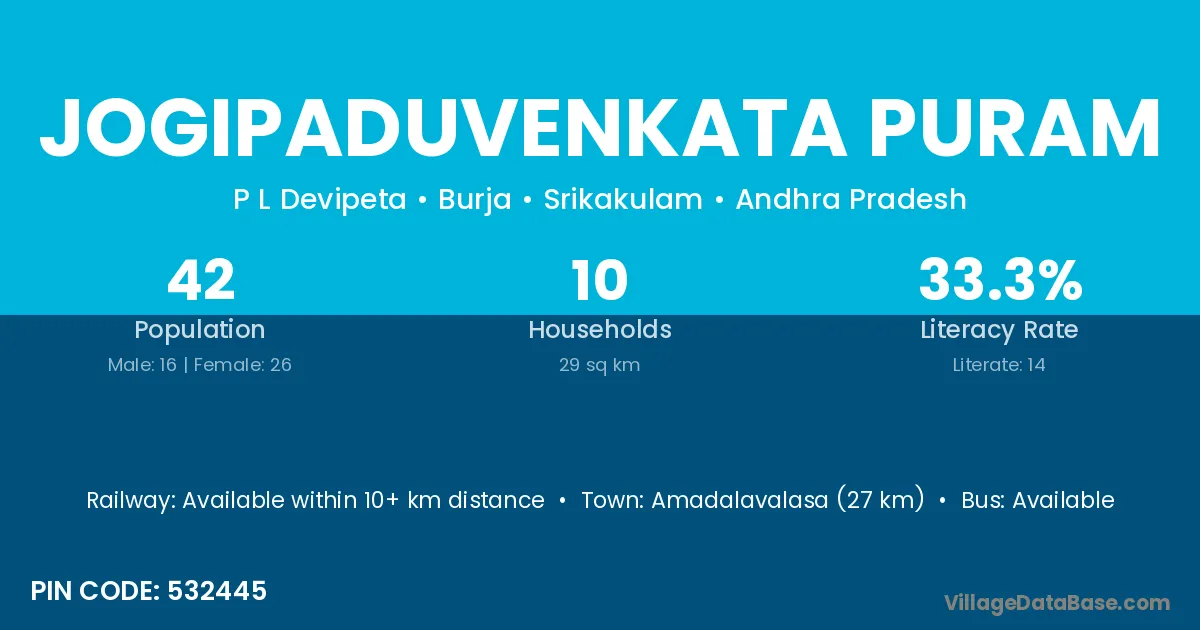 Jogipaduvenkata Puram village has a total population of 42 people, of which 16 are males and 26 are females.