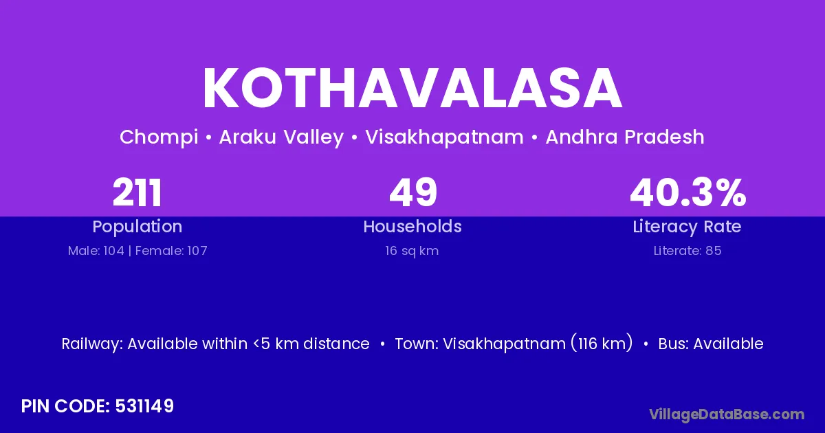 Kothavalasa village has a total population of 42 people, of which 21 are males and 21 are females.