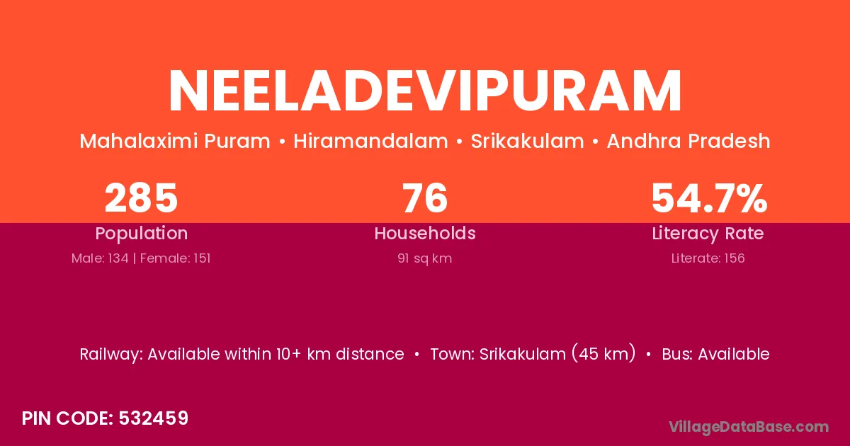 Amadalavalasa (16 km) is the nearest town to Neeladevipuram village for major economic activities and is located approximately 16 km away.