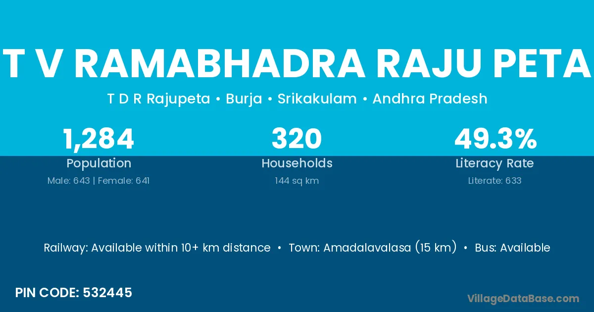 Amadalavalasa (15 km) is the nearest town to T V Ramabhadra Raju Peta village for major economic activities and is located approximately 15 km away.