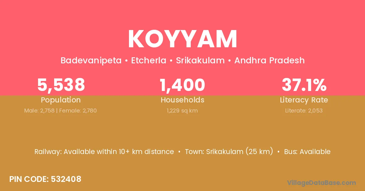 According to Census 2011 information, the village code of Koyyam village is 532408.