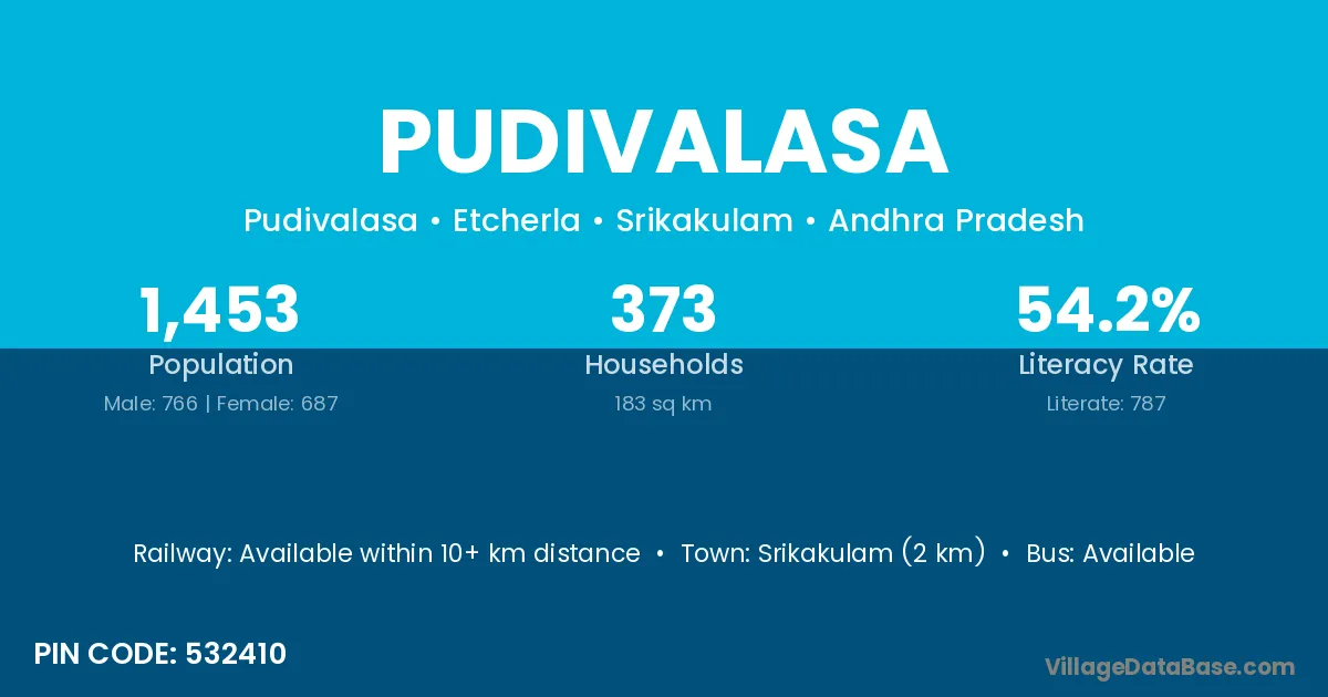 Pudivalasa village has a total population of 1,453 people, of which 766 are males and 687 are females.