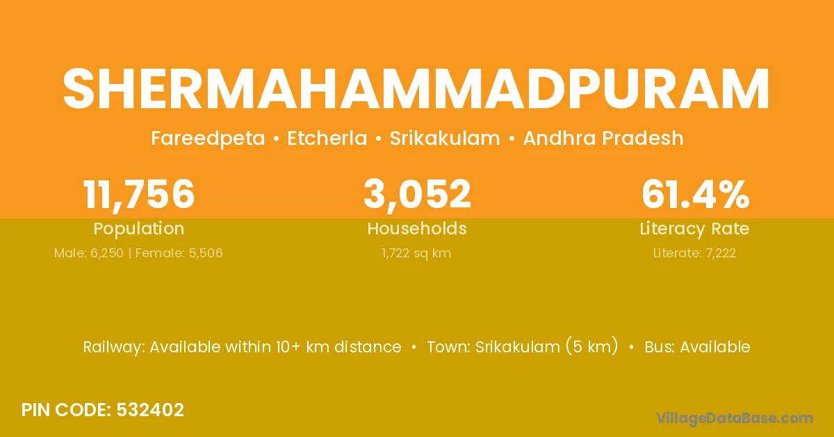 Shermahammadpuram village has a total population of 11,756 people, of which 6,250 are males and 5,506 are females.